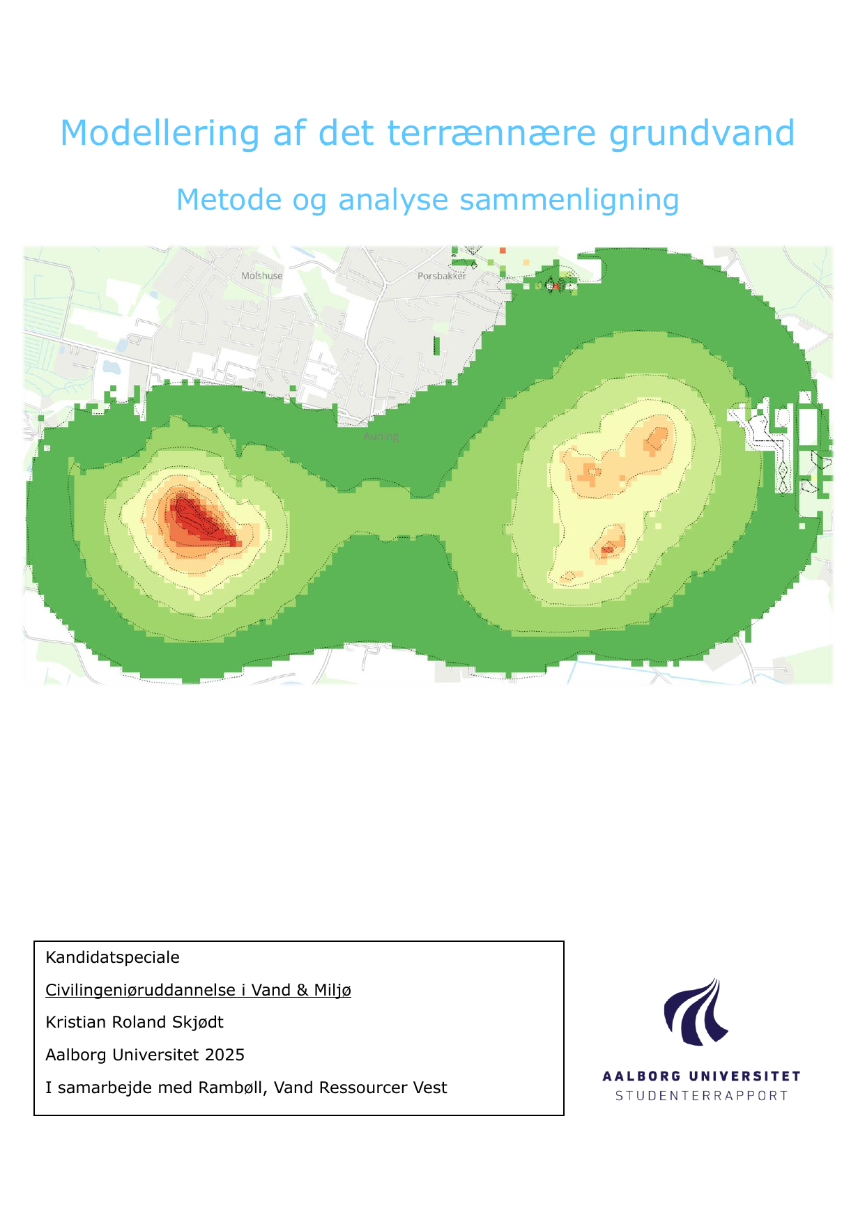 Dette speciale fokuserer på analyse og modellering af det terrænnære grundvand. I juni 2025 blev der vedtaget ny dansk lovgivning, som pålægger forsyningsselskaber at håndtere terrænnært grundvand i områder, hvor kommunerne tildeler denne pligt. På nuværende tidspunkt er der dog begrænset viden om, hvilket analyse-, model- og designniveau der er nødvendigt for dimensionering af dræn og risikovurdering i forhold til terrænnært grundvand. Specialet undersøger et casestudie i Auning, hvor der allerede er kendte problemer med højtstående terrænnært grundvand. Undersøgelsen udføres på flere niveauer. Først gennemføres en screening ved hjælp af regionale modeller, historiske kort og registreringer af lokale menneskelige påvirkninger. Derefter følger en analyse af målinger af grundvandsstanden: data indsamlet af Rambøll mellem december 2024 og maj 2025 samt supplerende målinger, der dækker perioden december 2020 til juni 2025. Resultaterne viser, at nogle områder står over for større udfordringer med terrænnært grundvand end andre. Lovgivningen fastslår, at de valgte metoder skal baseres på samfundsøkonomiske cost-benefit-analyser. I dette speciale vurderes den potentielle etablering af underjordiske dræn i eksisterende vejarealer ved hjælp af to tilgange: en forenklet analytisk løsning og en mere avanceret numerisk model, MIKE SHE. Begge tilgange giver resultater af sammenlignelig størrelsesorden, men adskiller sig i graden af usikkerhed. Den analytiske løsning bygger på flere antagelser om strømningsforhold og er begrænset til stationære tilstande, mens MIKE SHE er transiente, inkluderer en større del af den hydrologiske cyklus og kan udføre beregninger af drænafstrømning på tværs af flere områder samtidigt. MIKE SHE vurderes derfor at være mere velegnet til højrisikoområder tæt på beskyttet natur eller eksisterende bygninger, mens den analytiske tilgang kan være tilstrækkelig i lavrisikoområder længere væk fra sårbare lokaliteter. En central erkendelse er, at det terrænnære grundvand i høj grad påvirkes af vandindholdet i kapillarzonen. MIKE SHE anvender en forenklet beskrivelse af den umættede zone, og denne simple repræsentation blev evalueret mod en dedikeret umættet zone-model, Moving Mean Slope (MMS)-modellen. MMS var i stand til at simulere målte grundvandsstande med en nøjagtighed på 0–10 cm og gengav dynamikken og variationerne i grundvandsstanden i langt højere grad end MIKE SHE. Specialets bredere perspektiv er, at det nødvendige detaljeringsniveau for modelleringen bør bestemmes ud fra risikovurderingen af det undersøgte område. En høj risikovurdering bør derfor matche en mere detaljeret model. Særligt viser MMS potentiale som supplement til regionale screeningsværktøjer som HIP og KAMP ved at inddrage Jordartskortet i disse screeningsværktøjer for at tage højde for grundvandsstigning forårsaget af processer i kapillarzonen. Dette kunne opnås gennem en stationær løsning for MMS, der er afhængig af jordtype og nedbør.